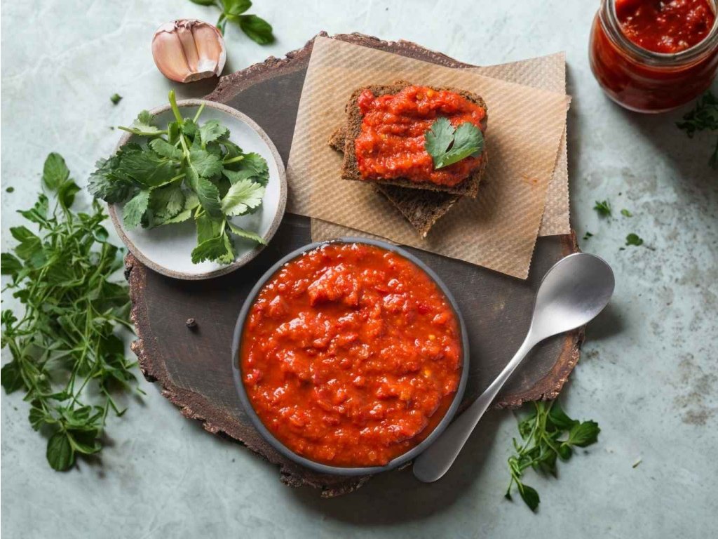- vyrobený z pečených červených paprik a lilku