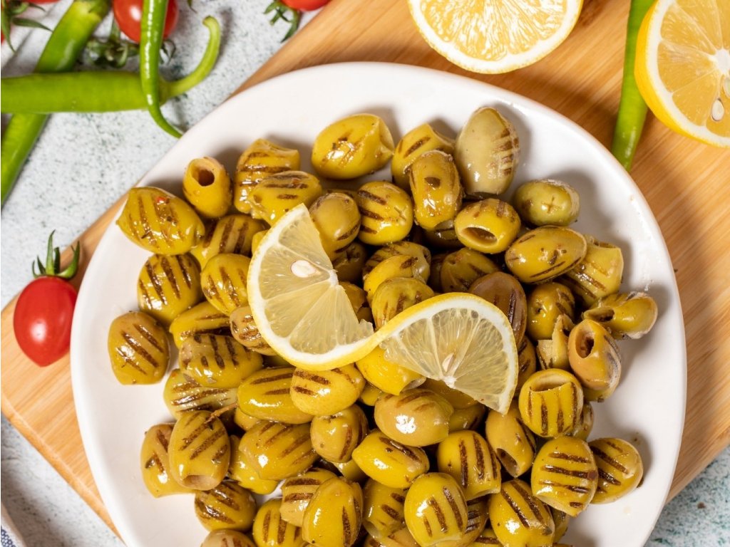 Grilování dodává olivám jemný kouřový nádech a lehce karamelizovanou slupku. Citronový nálev přináší svěžest, která vyvažuje jejich plnost a slanost.