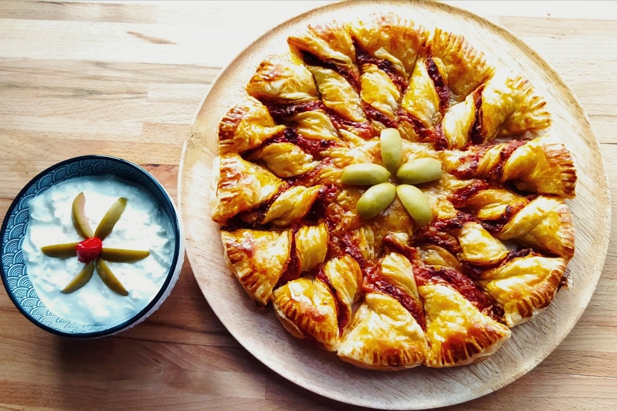 Ve středu si naznačte malou skleničkou kroužek. Od okraje kroužku nakrájejte proužky. Dávejte si pozor ať neporušíte vnitřní kroužek, který celé sluníčko drží pohromadě. Každý proužek dvakrát zatočte do spirálky. Všechny proužky zatáčejte ve stejném směru. Celé sluníčko potřete zbytkem rozšlehaného vejce.