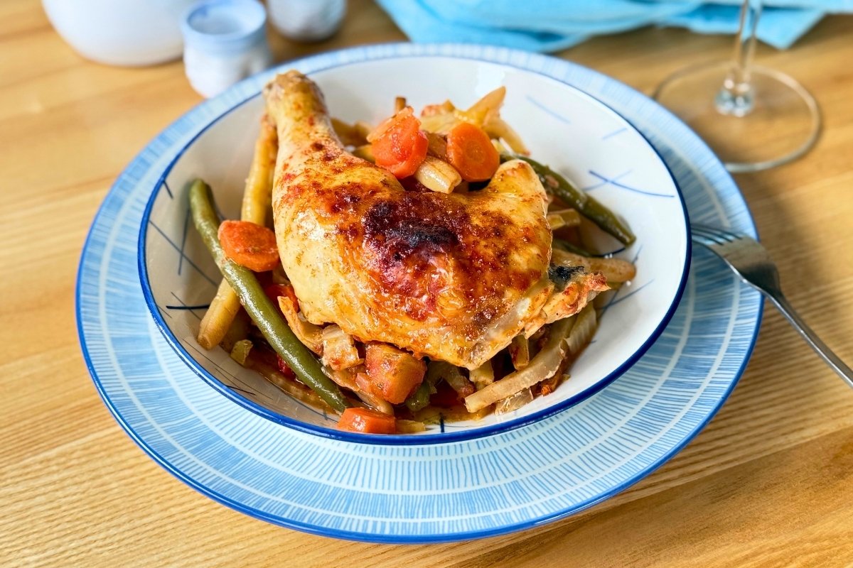 Přesně o tom je tento recept na pečené kuřecí čtvrtky na zelenině inspirované řeckou kuchyní.