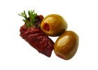 Velké masité zelené olivy jsou plněné krásně zralými rajčaty sušenými na sluníčku. Výrazná chuť rajčat Vás určitě potěší. Olivy jsou naložené v kvalitním slunečnicovém oleji...